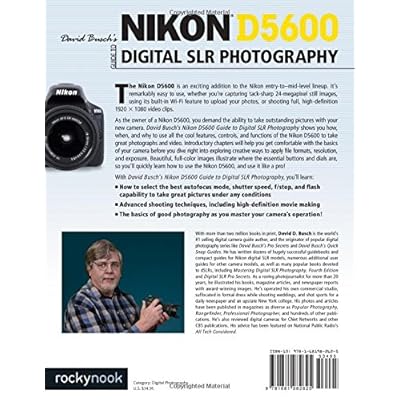 From the Author No, Sony has not bought out Nikon, although I must have had Sony on the brain when I began writing my comprehensive guide to the Nikon D5600. (There is no Sony D5600, folks.) The new D5600 is the best entry-/mid-level camera Nikon has introduced, and I know you'll enjoy yours as much as I enjoyed writing about it. I'm happy to be your mentor, helping you discover all the great things this camera can do. And I do appreciate those who take the time to send their comments and suggestions directly to me, as I request on Page xvi of the book. Your feedback helps me make each individual book, and those yet unwritten, better than the last. Thanks! Read more About the Author With more than two million books in print, David D. Busch is the world’s #1 best-selling camera guide author, with more than 100 guidebooks for Nikon, Canon, Sony, Olympus, Pentax, and Panasonic cameras, and many popular books devoted to digital photography and imaging techniques. His best-sellers include Digital SLR Cameras and Photography for Dummies, which has sold more than 300,000 copies in five editions, and Mastering Digital SLR Photography, now in its Fourth Edition. The graduate of Kent State University is a former newspaper reporter/photographer, and operated his own commercial photo studio, shooting sports, weddings, portraits, fashion, architecture, product photography, and travel images. For 22 years he was a principal in CCS/PR, Inc., one of the largest public relations/marketing firms based in San Diego, working on press conferences, press kits, media tours, and sponsored photo trade magazine articles for Eastman Kodak Company and other imaging companies. His 2500 articles and accompanying photos have appeared inside and on the covers of hundreds of magazines, including Popular Photography, Rangefinder, and Professional Photographer. For the last decade, Busch has devoted much of his time to sharing his photographic expertise, both in publications, and in seminar/workshops he hosts at the Cleveland Photographic Society School of Photography. He has been a call-in guest for 21 different radio shows nationally and in major markets, including WTOP-AM (Washington), KYW-AM (Philadelphia), USA Network (Daybreak USA), WPHM-AM (Detroit), KMJE-FM (Sacramento), CJAD-AM (Montreal), WBIX-AM (Boston), ABC Radio Network (Jonathan & Mary Show). He’s also been a call-in guest for one Canadian television show, and appeared live on Breakfast Television in Toronto, the Today Show of the Great White North. With a total of more than 200 books to his credit, Busch has had as many as five books appear simultaneously in the Amazon.com Top 25 Digital Photography Books, and when Michael Carr of About.com named the top five digital photography books for beginners, the initial #1 and #2 choices were Busch’s Digital Photography All-in-One Desk Reference for Dummies and Mastering Digital Photography. His work has been translated into Arabic, Spanish, Chinese, Japanese, Portuguese, Bulgarian, German, Italian, French, and other languages. Busch’s Web portal is www.dslrguides.com Read more